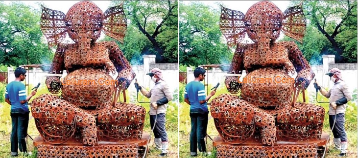 रेलवे के विभिन्न स्क्रैप मटेरियल से लोहे के गणेशजी की कलाकृति तैयार हो रही है.