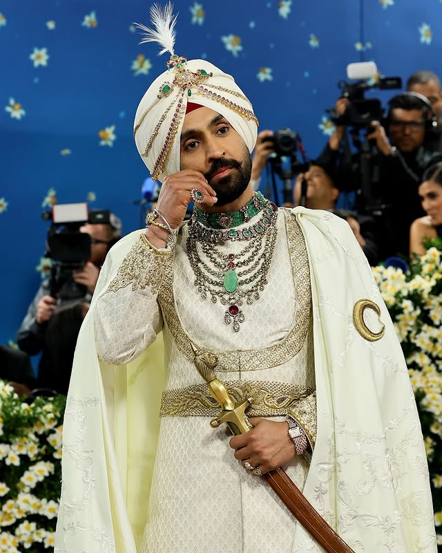 दिलजीत दोसांझ ने मेट गाला 2025 में अपनी पहली धमाकेदार एंट्री की और अपने पंजाबी संस्कृति को पूरी शान से दुनिया के सामने पेश किया, डिजाइनर प्रबल गुरुंग के बनाए 'महाराजा लुक' में ऑफ-व्हाइट अचकन, पायजामा और पगड़ी में नजर आए