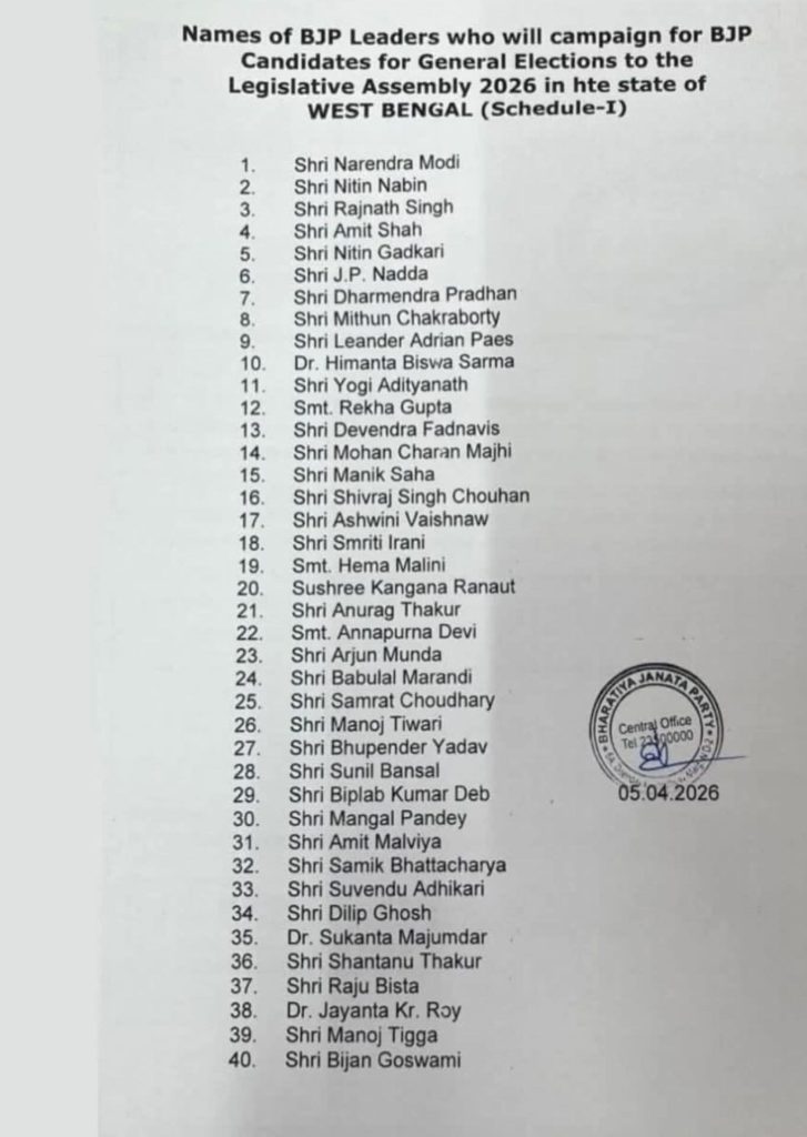 भाजपा की इस सूची में सबसे प्रमुख नाम प्रधानमंत्री नरेंद्र मोदी का है जो बंगाल में कई बड़ी रैलियों को संबोधित करेंगे। उनके साथ केंद्रीय गृह मंत्री अमित शाह, रक्षा मंत्री राजनाथ सिंह, नितिन गडकरी और भाजपा के राष्ट्रीय अध्यक्ष जेपी नड्डा जैसे दिग्गज नेता मोर्चा संभालेंगे। साथ ही धर्मेंद्र प्रधान, शिवराज सिंह चौहान और अश्विनी वैष्णव भी चुनावी रण में पसीना बहाते नजर आएंगे।