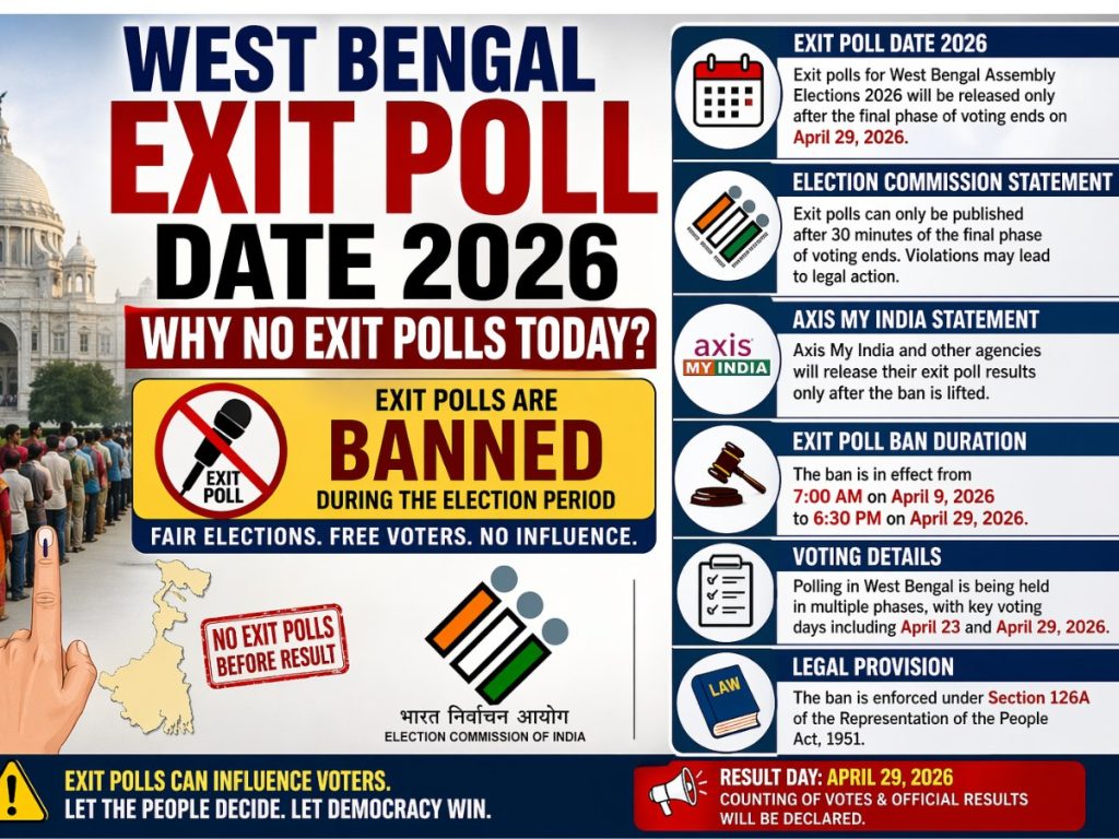 West Bengal Exit Poll Date 2026:देश में इस वक्त पश्चिम बंगाल और असम समेत 5 राज्यों में विधानसभा चुनाव हो रहे हैं। असम और तमिलनाडु समेत 4 राज्यों के चुनाव खत्म हो गए हैं। अब लोोगं को रिजल्ट का इंजार है। जबकि पश्चिम बंगाल विधानसभा चुनाव दो चरण में हो रहा है। 23 अप3ैल को पहले चरण का मतदान खत्म हुआ। अब 29 अप्रैल को दूसरे चरण का मतदान होना है। 5 राज्यों में से सबसे ज्यादा आकर्षण का केंद्र पश्चिम बंगाल है। बंगाल में 15 साल से ममता बनर्जी की सरकार है। वहीं बीजेपी इस बार सत्ता में आने के लिए पूरा दमखम लगाए हुए हैं। ऐसे में देश की जनता का सारा ध्यान बंगाल पर आकर टिक गया है। हर कोई जानना चाहता है कि बंगाल में इस बार कौन खेला करेगा। इस लिए पहले चरण के मतदान खत्म होने के साथ ही लोग बंगाल एग्जिट पोल के बारे में सर्च करने लगे हैं।