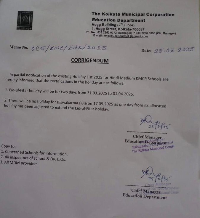 बता दें कि विश्वकर्मा पूजा की छुट्टी 17 सितंबर को दी जाती है। वहीं कोलकाता नगर निगम की ओर से जारी आदेश में साफ साफ लिखा गया था कि 17 सितंबर 2025 को विश्वकर्मा पूजा की छुट्टी नहीं रहेगी। इस छुट्टी के बदले ईद उल फितर की छुट्टी बढ़ा दी गई है। इस आदेश के अनुसार राज्य में ईद उल फितर की छुट्टी 31 मार्च 2025 और 1 अप्रैल 2025 को घोषित की गई थी।