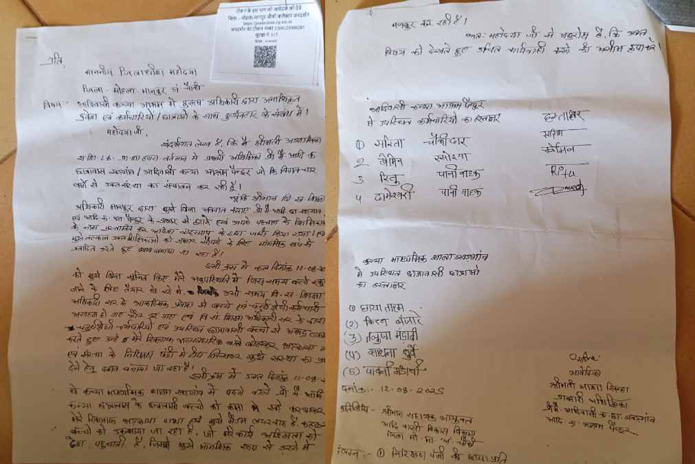 अधीक्षिका ने आवेदन में यह भी उल्लेख किया है कि बीईओ ने बिना उन्हें अवगत कराए खडगांव के छात्रावास और पेंदूर के आदिवासी कन्या आश्रम के प्रभार से हटाने एवं अपने पहचान के शिक्षिकाओं का नाम लिखा प्रस्तावित आदेश वॉट्सएप द्वारा जारी किया गया है। प्रभारी अधीक्षिका ने आवेदन में यह आरोप भी लगाया है कि उन्हें तत्काल उक्त शिक्षिकाओं को प्रभार सौंपने के लिए मानसिक रूप से प्रताड़ित करते हुए दबाव बनाया जा रहा है। यही नहीं 11 अगस्त को ही कन्या माध्यमिक शाला में पढ़ने वाले प्री मैट्रिक आदिवासी कन्या छात्रावास के छात्रावासी बच्चों को कक्षा में खड़े कराकर उन्हें मेरे खिलाफ भड़काया गया और मुझे मैडम लापरवाह है कहकर बच्चों को उकसाया जा रहा है। ज्ञापन में अधीक्षिका ने यह भी कहा है कि यह कृत्य मेरे कार्य अस्मिता को ठेस पहुंचाती है, जिससे मुझे मानसिक रूप से डरने में मजबूर कर रही है।