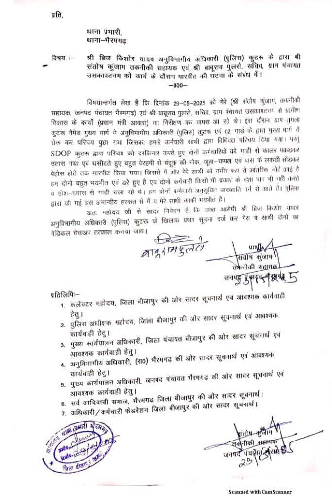 सुरेश परतागिरी, बीजापुर। छत्तीसगढ़ के बीजापुर जिले से मारपीट का एक सनसनीखेज मामला सामने आया है, जहां भैरमगढ़ जनपद पंचायत में पदस्थ तकनीकी सहायक संतोष कुंजाम और पंचायत सचिव बाबू राव पुलसे के साथ कुटरू एसडीओपी ने बेरहमी से मारपीट की। बताया जा रहा है कि केवल सड़क पर साइड न देने की बात को लेकर अधिकारी ने दोनों कर्मचारियों की सरेराह बेदम पिटाई कर दी। घटना के विरोध में भैरमगढ़ जनपद के सभी कर्मचारियों ने काम बंद करने की चेतावनी दी है और दोषी अधिकारी पर FIR दर्ज करने की मांग की है।