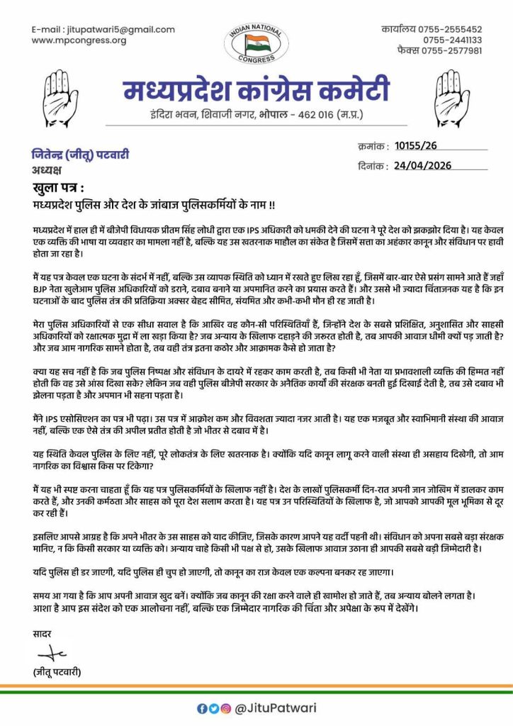 शिखिल ब्यौहार, भोपाल। मध्यप्रदेश में हाल ही में बीजेपी विधायक प्रीतम सिंह लोधी द्वारा एक IPS अधिकारी को धमकी देने की घटना को लेकर पीसीसी चीफ जीतू पटवारी ने पुलिस की भूमिका और कार्यशैली पर बड़ा सवाल उठाया है। मामले को लेकर उन्होंने एमपी पुलिस को पत्र लिखा है। उन्होंने लिखा- घटना ने पूरे देश को झकझोर दिया है। यह केवल एक व्यक्ति की भाषा या व्यवहार का मामला नहीं है, बल्कि यह उस खतरनाक माहौल का संकेत है जिसमें सत्ता का अहंकार कानून और संविधान पर हावी होता जा रहा है।