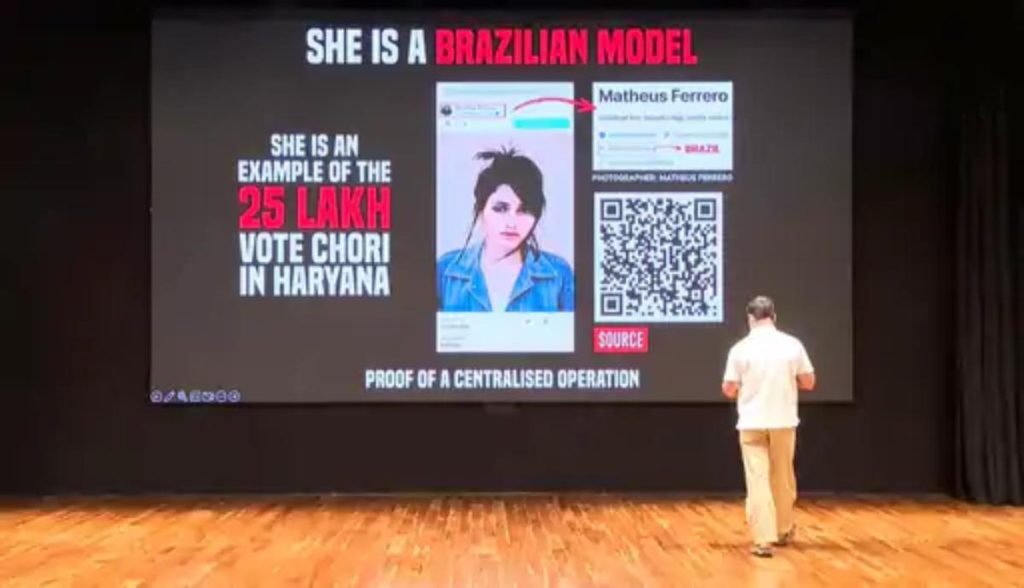 राहुल गांधी ने कहा कि यह ब्राजीलियन मॉडल है। महिला का नाम मैथ्यूज फेरारो (Matheus Ferroro) नहीं है। Matheus Ferroro उस फोटोग्राफर का नाम है, जिसने यह फोटो क्लिक की थी। यह फोटो Unsplash और Pexels जैसी वेबसाइटों पर फोटोग्राफर की प्रोफाइल में उपलब्ध है। इसे हरियाणा का वोटर बनाकर इसके अलग-अलग नाम से 10 बूथ पर 22 बार फर्जी वोटिंग कराई गई थी। इस खेल में खुद चुनाव आयोग शामिल था।