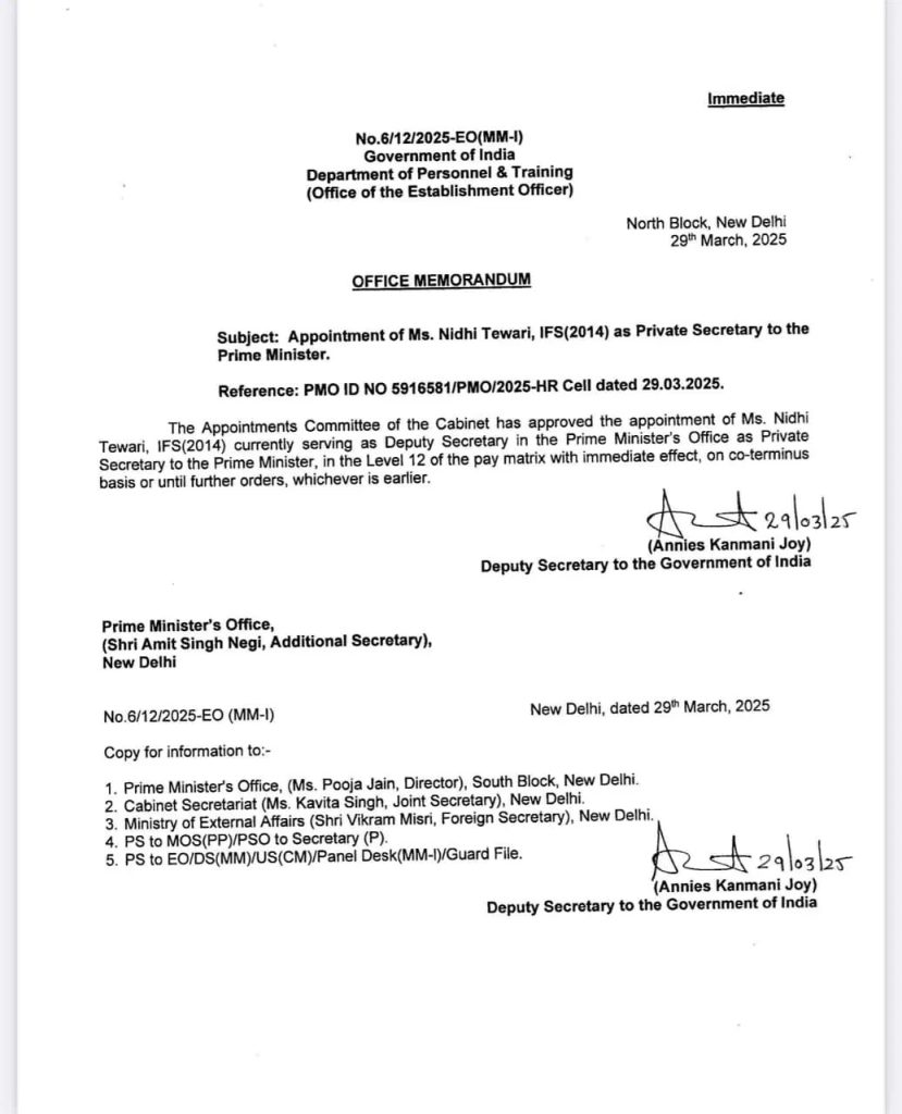 आदेश में उल्लेख किया गया है कि कैबिनेट की नियुक्ति समिति ने आईएफएस अधिकारी निधि तिवारी को प्रधानमंत्री नरेंद्र मोदी की निजी सचिव के रूप में नियुक्त करने की स्वीकृति दी है. निधि तिवारी वर्तमान में प्रधानमंत्री कार्यालय में डिप्टी सेक्रेटरी के पद पर कार्यरत हैं, जहां उन्हें 2022 में नियुक्त किया गया था. इससे पूर्व, उन्होंने विदेश मंत्रालय में अंतरराष्ट्रीय सुरक्षा मामलों से संबंधित कार्य किया था.