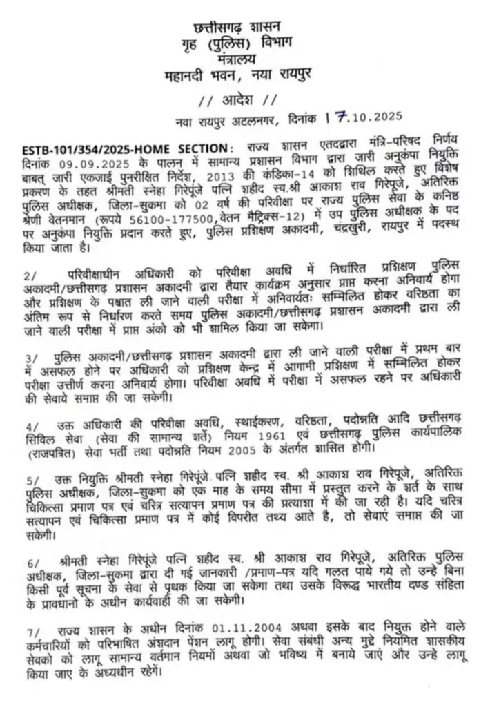 रायपुर। छत्तीसगढ़ के सुकमा में नक्सली हमले में शहीद हुए अतिरिक्त पुलिस अधीक्षक आकाश राव गिरेपुजे की पत्नी को राज्य सरकार ने अनुकंपा नियुक्ति दी है. स्नेहा गिरेपुजे को दो वर्ष की परिवीक्षा पर पुलिस अकादमी, चंद्रखुरी में उप पुलिस अधीक्षक के पद पर नियुक्त किया है.