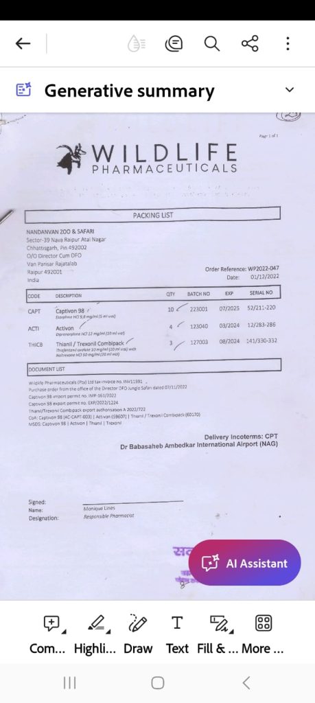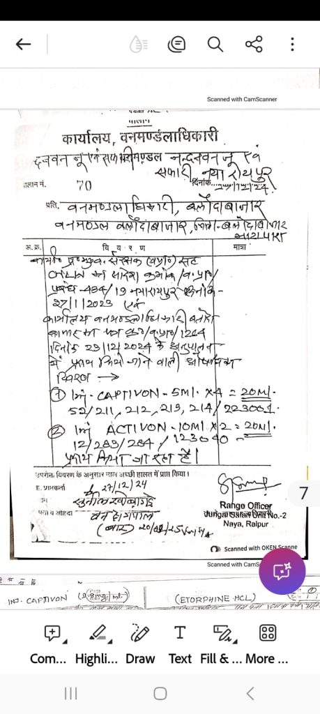 बेहोश करने वाली कैपटीवान और बेहोशी से निकालने वाली एक्टिवोन, दोनों दवाईयां साउथ अफ्रीका के वाइल्डलाइफ फार्मास्युटिकल्स से दिसम्बर 2022 में जंगल सफारी प्रबंधन ने बुलवाई थी. इसमें से बेहोशी से निकालने वाली दवा एक्टिवोन के बैच का नंबर 123040 था जिसकी चार शीशी (प्रत्येक 10 मिलीलीटर की) आई, जिनका सीरियल नंबर 12/283, 284, 285, 286 था. इनकी कालातीत होने का समय कंपनी ने मार्च 2024 बताया था. इनमे से बाइसन ट्रांसलोकेशन के लिए सीरियल नंबर 12/283 और 284 कालातीत होने के नौ माह बाद जंगल सफारी प्रबंधन ने 27 दिसम्बर 2024 को बलोदाबाजार वनमण्डल भेजी, जहां बारनावापारा अभ्यारण आता है. 25 जनवरी 2025 को बाइसन को बारनावापारा अभ्यारण में बेहोश करने के बाद बेहोशी से निकालने के लिए इनमें से कालातीत एक्टिवोन का प्रयोग किया गया.