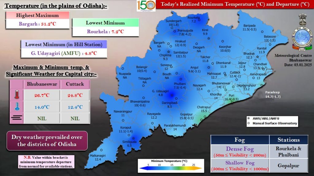 भारतीय मौसम विभाग द्वारा आज सुबह साझा किए गए मौसम अपडेट के अनुसार, पिछले 24 घंटों में जिन अन्य स्थानों पर पारा 10 डिग्री सेल्सियस और उससे नीचे चला गया, वे हैं सेमीलीगुड़ा (6.5 डिग्री सेल्सियस), राउरकेला (7.2 डिग्री सेल्सियस), फुलबनी (7.5 डिग्री सेल्सियस), झारसुगुड़ा (7.8 डिग्री सेल्सियस), दारिंगबाड़ी (8.5 डिग्री सेल्सियस), संबलपुर में चिपलिमा (9.3 डिग्री सेल्सियस), अनुगुल (9.6 डिग्री सेल्सियस), सुंदरगढ़ में किरेई (9.9 डिग्री सेल्सियस) और सुंदरगढ़ (10 डिग्री सेल्सियस)। झारसुगुड़ा में रात का तापमान सामान्य से 4.2 डिग्री सेल्सियस नीचे दर्ज किया गया।