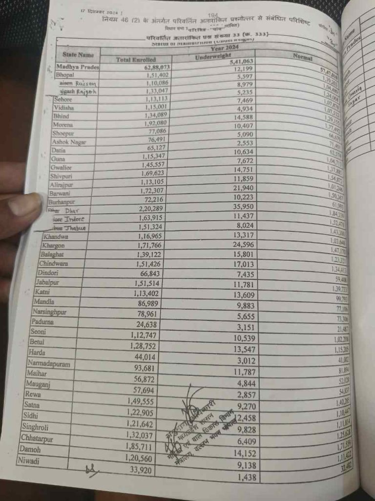 एमपी विधानसभा में कांग्रेस विधायक के सवाल पर महिला बाल विकास मंत्री निर्मला भूरिया ने बताया कि अति कुपोषित बच्चों के लिए मुख्यमंत्री बाल संवर्धन योजना चल रही है। इसके तहत ही राशि दी जा रही है। मंत्री ने यह भी बताया कि हर बच्चे को गुणवत्तापूर्ण भोजन के लिए चार रुपए का खर्च किया जा रहा है। जबकि दूसरे सवाल में मंत्री ने बताया कि 5 लाख 41 हजार से अधिक बच्चे कुपोषित है।