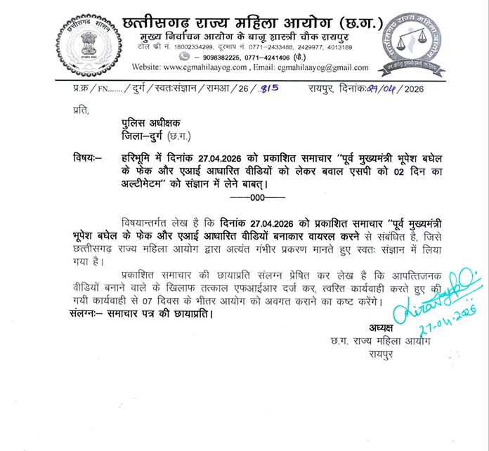दिनांक 27.04.2026 को एक प्रतिष्ठित समाचार पत्र में प्रकाशित खबर, जिसका शीर्षक “पूर्व मुख्यमंत्री भूपेश बघेल के फेक और एआई आधारित वीडियो को लेकर बवाल, एसपी को 02 दिन का अल्टीमेटम” है, उसके आधार पर आयोग ने यह कार्रवाई शुरू की है। आयोग के अनुसार, आधुनिक तकनीक (AI) का दुरुपयोग कर पूर्व मुख्यमंत्री और एक महिला से संबंधित भ्रामक व आपत्तिजनक वीडियो वायरल किया जा रहा है, जिससे समाज में गलत संदेश जा रहा है।