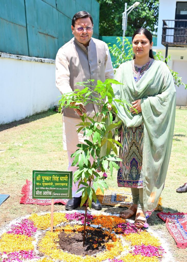 मुख्यमंत्री पुष्कर सिंह धामी ने गुरुवार को विश्व पर्यावरण दिवस (World Environment Day) के अवसर पर मुख्यमंत्री आवास में “एक पेड़ मां के नाम” अभियान के अंतर्गत पौधारोपण किया. इस अवसर पर उन्होंने सीता अशोक का पौधा लगाया. इस दौरान सीएम के साथ उनकी पत्नी भी मौजूद रहीं.
