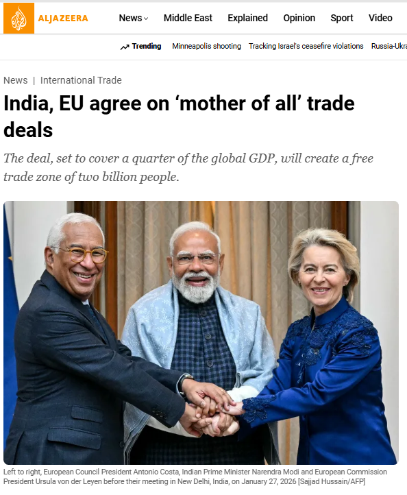 अलजजीरा ने लिखा- भारत और यूरोपीय यूनियन एक बड़े व्यापार समझौते पर सहमत हुए हैं। यूरोपियन कमीशन की अध्यक्ष उर्सुला वॉन डेर लेयेन और भारतीय प्रधानमंत्री नरेंद्र मोदी ने इसकी घोषणा की।