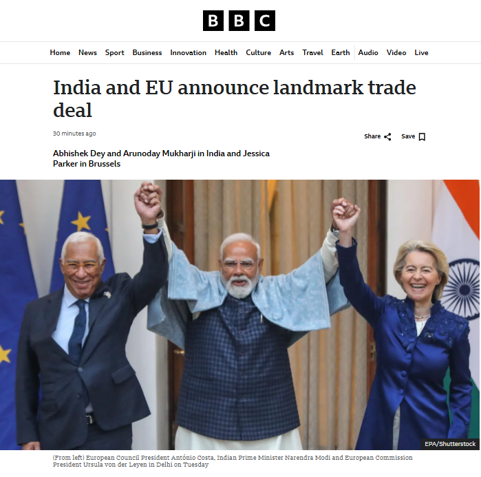 BBC ने लिखा- भारत और यूरोपियन यूनियन ने लगभग दो दशकों तक रुक-रुक कर चली बातचीत के बाद एक ऐतिहासिक व्यापार समझौते की घोषणा की है। दोनों पक्षों ने अमेरिका के साथ तनाव के बीच संबंधों को गहरा करने का लक्ष्य रखा है। यूरोपीय कमीशन की अध्यक्ष उर्सुला वॉन डेर लेयेन ने दिल्ली में एक मीडिया ब्रीफिंग में कहा, “हमने कर दिखाया, हमने अब तक का सबसे बड़ा समझौता कर दिखाया।” भारतीय प्रधानमंत्री नरेंद्र मोदी ने इस समझौते को “ऐतिहासिक” बताया।
