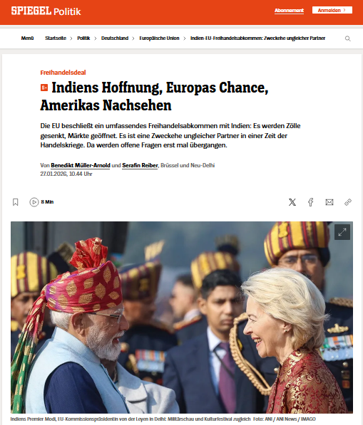 जर्मन मीडिया स्पीगेल ने लिखा- करीब 20 साल की बातचीत के बाद भारत और यूरोपीय यूनियन (EU) ने एक बड़े फ्री-ट्रेड समझौते को अंतिम रूप दिया है। समझौते के तहत भारत कई सेक्टरों में ऊंचे टैरिफ घटाएगा। खासतौर पर यूरोपीय कारों, मशीनरी और केमिकल उत्पादों पर शुल्क में बड़ी कटौती होगी। इससे यूरोपीय कंपनियों को अरबों यूरो की राहत मिलने की संभावना है। बदले में भारत को कपड़ा, ज्वेलरी और सेवाओं के निर्यात में बढ़त की उम्मीद है। इस पूरी कवायद में अमेरिका की भूमिका पहले जैसी नहीं दिखती। एक्सपर्ट्स के मुताबिक,अमेरिका की अनिश्चित व्यापार नीतियों के चलते भारत और यूरोप दोनों नए विकल्प तलाश रहे हैं।