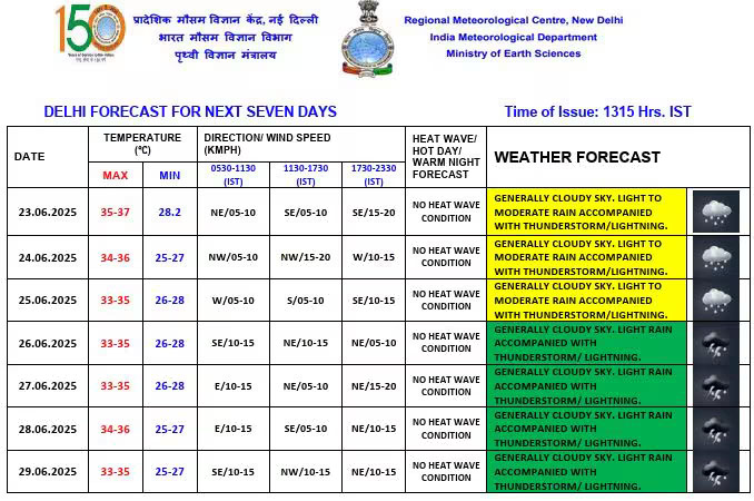 मौसम विभाग ने 26 से 29 जून तक दिल्ली और एनसीआर के शहरों में गरज-चमक और तेज हवाओं के साथ भारी बारिश का येलो अलर्ट जारी किया है. इन चार दिनों में दिल्ली का अधिकतम तापमान 33 से 35 डिग्री सेल्सियस के बीच रहने की संभावना है. भारतीय मौसम विभाग के अनुसार, इस पूरे सप्ताह मौसम ठंडा रहेगा, और इस दौरान बिजली गिरने की घटनाएं भी हो सकती हैं.