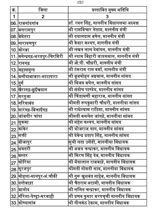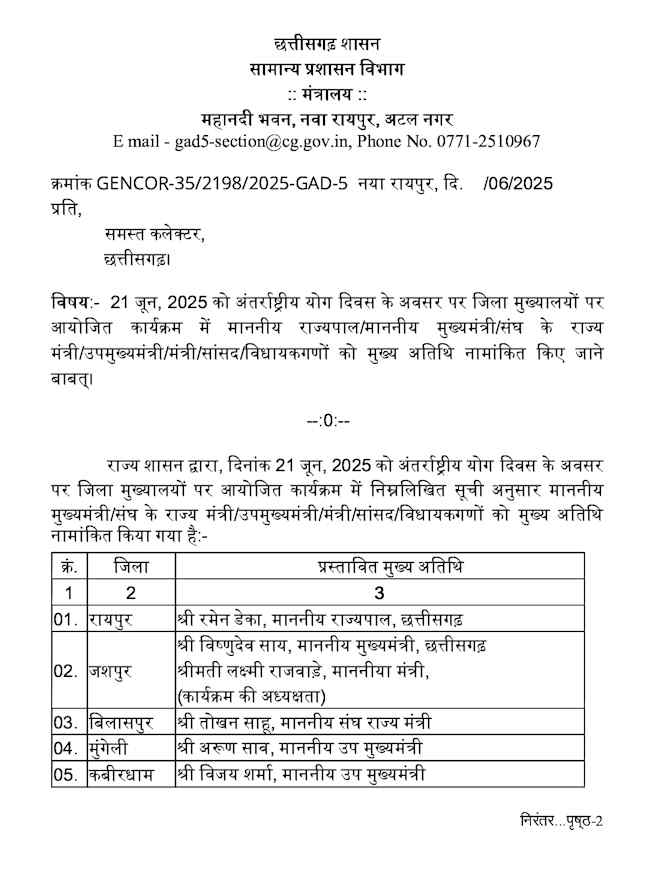 बता दें, सामान्य प्रशासन विभाग ने अंतरराष्ट्रीय योग दिवस पर होने वाले जिलेवार कार्यक्रम के लिए मुख्य अतिथियों की सूची जारी की है. रायपुर में होने वाले कार्यक्रम में राज्यपाल रमेन डेका तो वहीं जशपुर में होने वाले कार्यक्रम में मुख्यमंत्री विष्णु देव साय मुख्य अतिथि होंगे. डिप्टी सीएम अरुण साव मुंगेली के होने वाले कार्यक्रम में, तो वहीं डिप्टी सीएम विजय शर्मा कवर्धा में बतौर मुख्य अतिथि मौजूद रहेंगे.